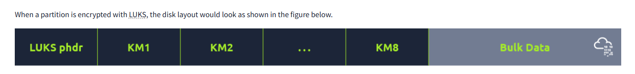 - KM: KM stands for Key Material, where we have KM1, KM2, …, KM8. Each key material section is associated with a key slot, which can be indicated as active in the LUKS phdr. When the key slot is active, the associated key material section contains a copy of the master key encrypted with a user’s password. In other words, we might have the master key encrypted with the first user’s password and saved in KM1, encrypted with the second user’s password and saved in KM2, and so on.
